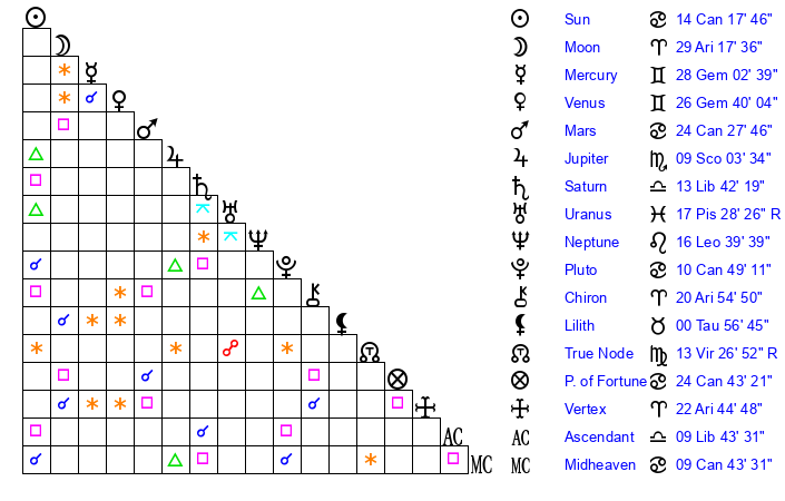 | Moon | 29 Aries 14 | 6 Sagittarius 27 | 0 Aquarius 19 |