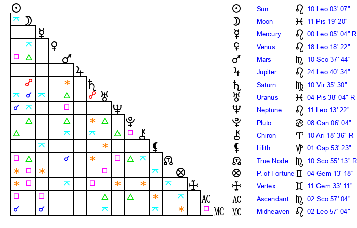 | Venus | 18 Leo 19 | 2 Cancer 57 | 27 Sagittarius 32 |