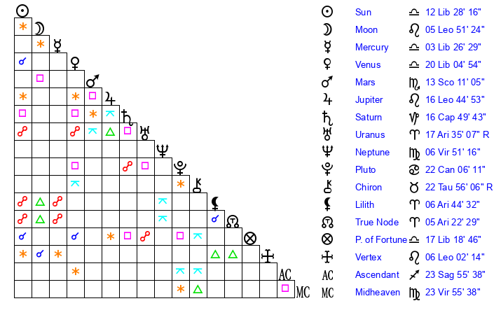 | Sun | 12 Libra 28 | 13 Libra 41 | 17 Capricorn 13 |