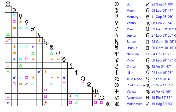 | Moon | 8 Leo 7 | 6 Scorpio 26 | 10 Leo 8 |