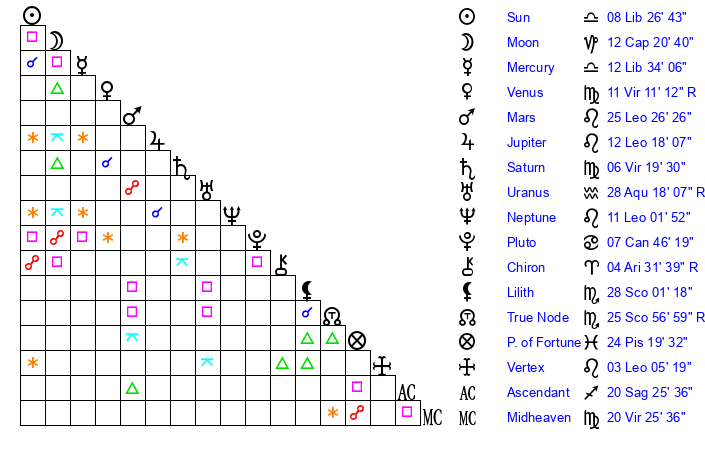 | Saturn | 6 Virgo 58 | 27 Pisces 31 | 11 Virgo 53 |