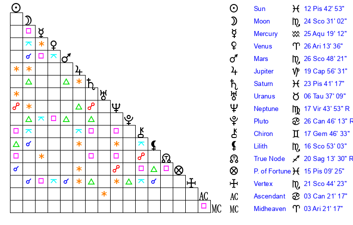 | Sun | 12 Pisces 42 | 13 Pisces 22 | 8 Gemini 50 |