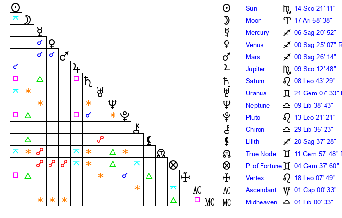 Moon | 17 Aries 56 | 22 Capricorn 20 | 26 Aquarius 14 |