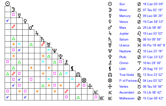 | Sun | 18 Cancer 5 | 18 Cancer 41 | 29 Libra 59 |