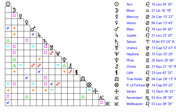 | Sun | 10 Leo 55 | 11 Leo 36 | 6 Sagittarius 6 |