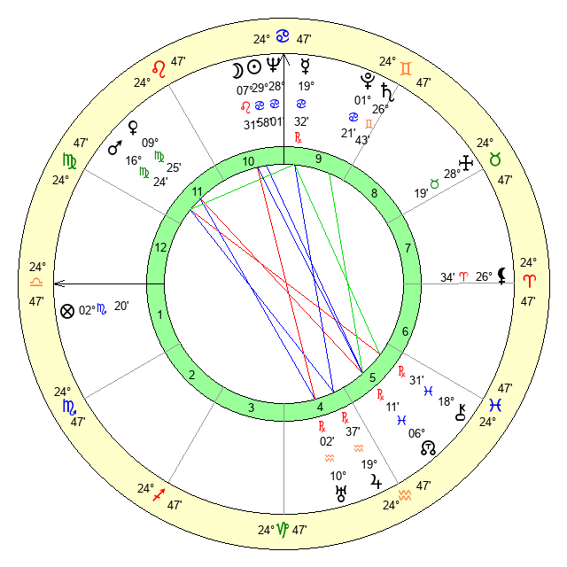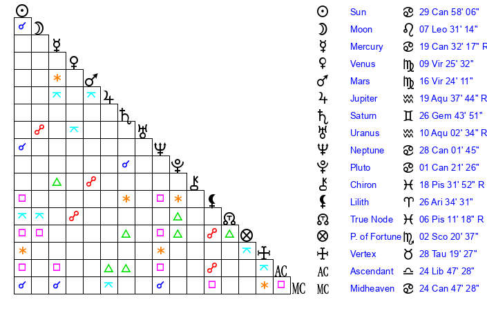 | Moon | 7 Leo 35 | 16 Cancer 48 | 27 Leo 21 |