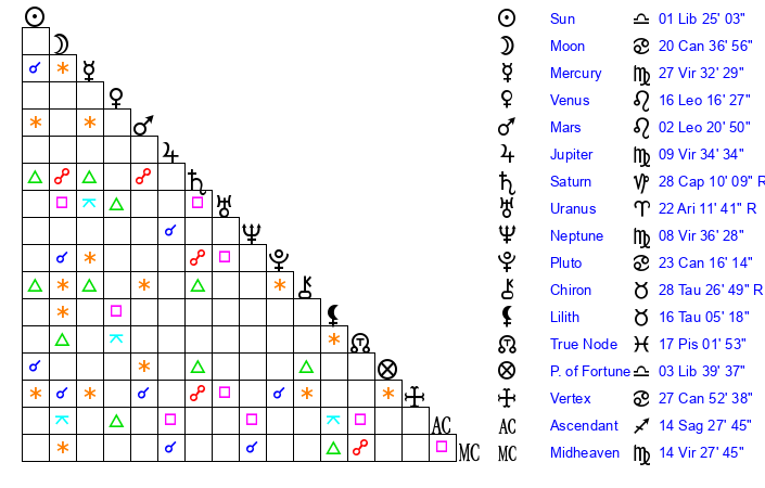 | Mars | 2 Leo 20 | 1 Scorpio 36 | 16 Virgo 43 |