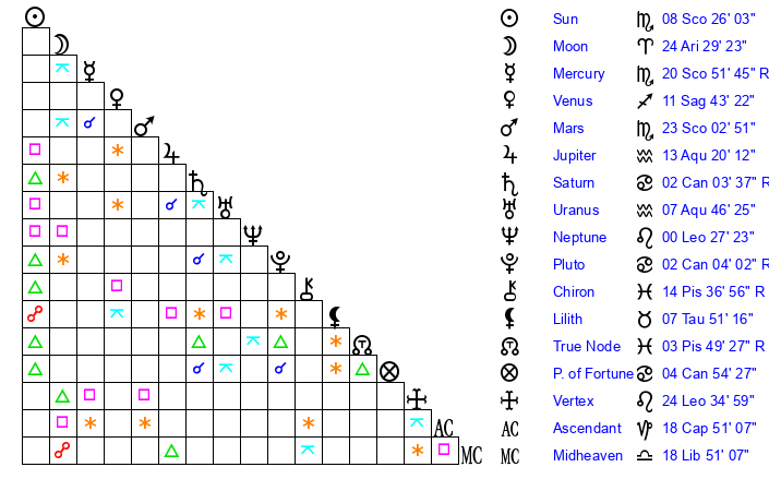| Sun | 8 Scorpio 26 | 9 Scorpio 31 | 0 Pisces 59 |