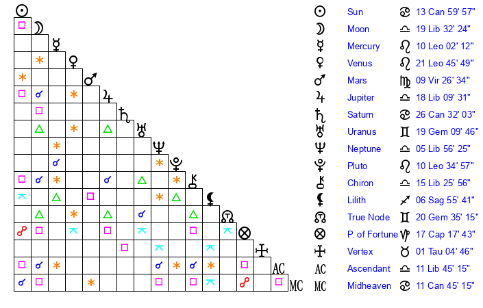 | Moon | 19 Libra 44 | 27 Scorpio 25 | 9 Virgo 39 |
