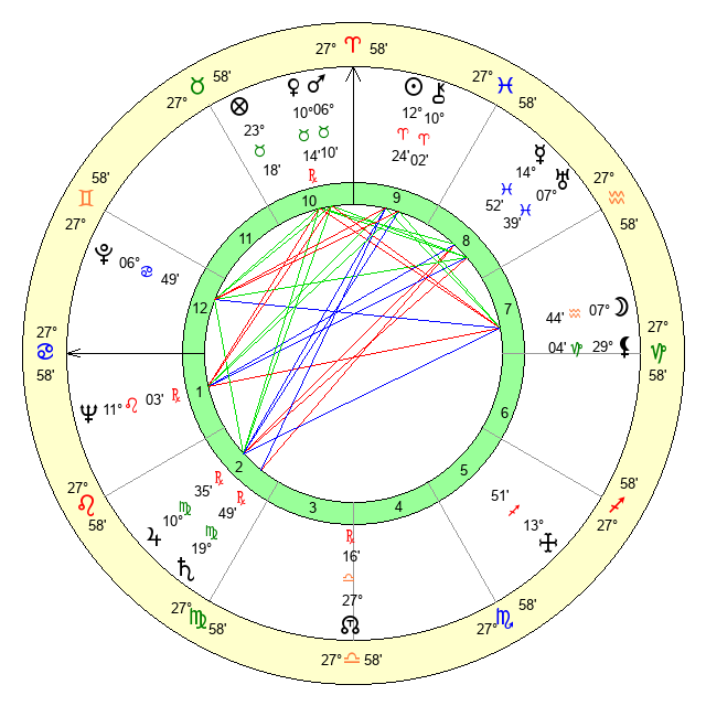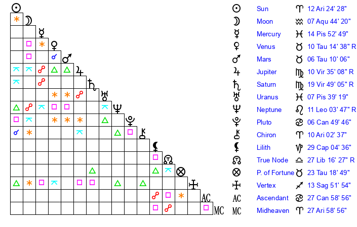 | Moon | 7 Aquarius 36 | 12 Gemini 27 | 4 Sagittarius 35 |