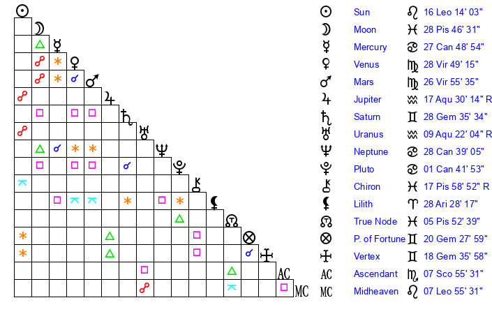 | Neptune | 28 Cancer 40 | 1 Aries 50 | 0 Leo 17 |