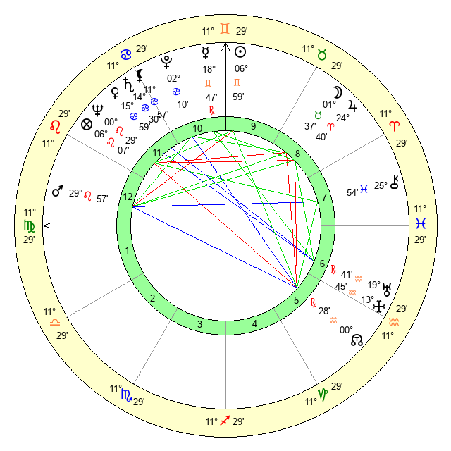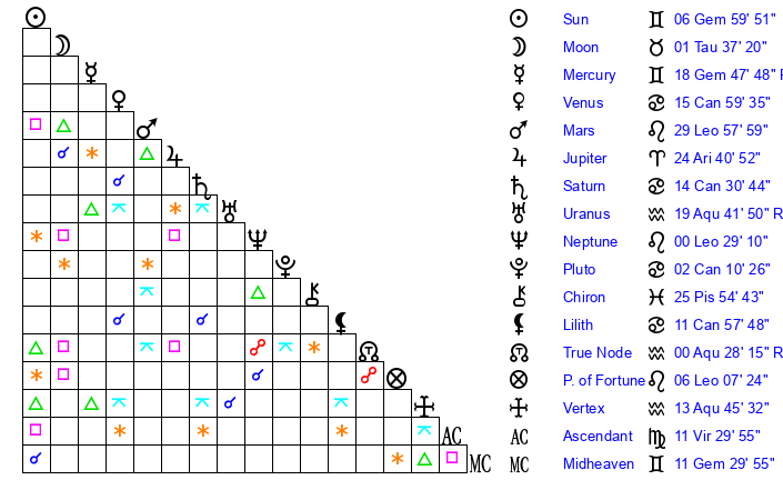 | Sun | 6 Gemini 59 | 7 Gemini 37 | 21 Virgo 31 |