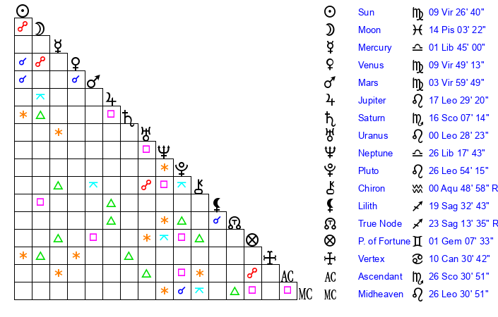 | Pluto | 26 Leo 54 | 1 Aquarius 44 | 28 Leo 31 |
