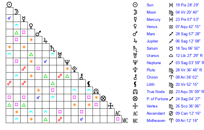 | Sun | 19 Pisces 28 | 20 Pisces 22 | 12 Taurus 36 |