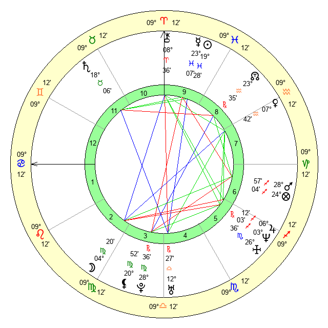 | Moon | 4 Virgo 15 | 9 Leo 35 | 28 Leo 0 |