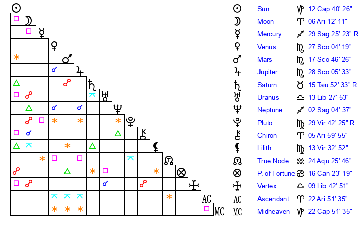 | Sun | 12 Capricorn 40 | 13 Capricorn 19 | 8 Pisces 27 |