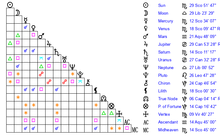 | Moon | 29 Libra 22 | 27 Sagittarius 9 | 1 Gemini 54 |