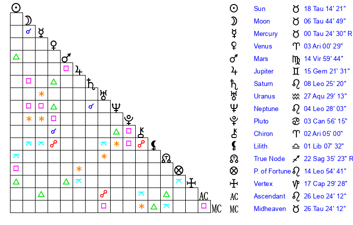 | Mercury | 0 Taurus 24 | 28 Aries 40 | 15 Virgo 30 |