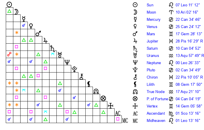 | Neptune | 0 Leo 27 | 1 Aries 58 | 2 Leo 38 |
