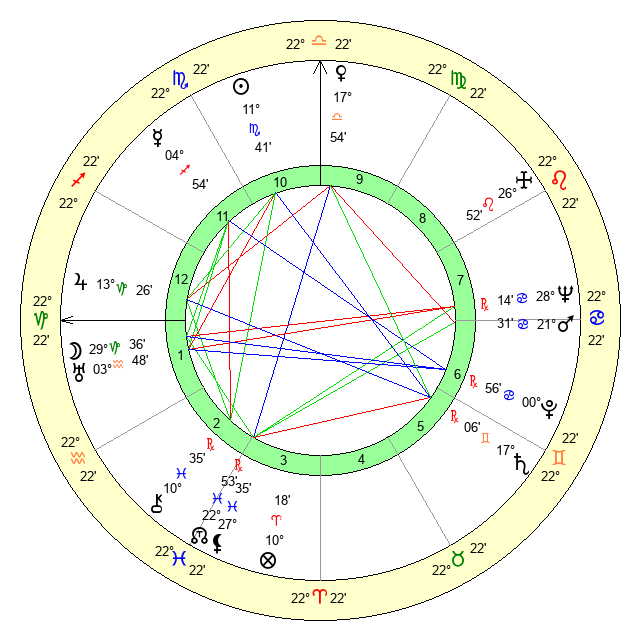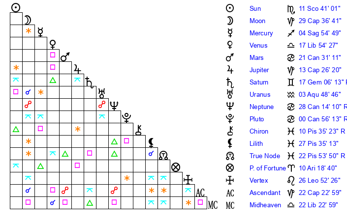 | Sun | 11 Scorpio 41 | 12 Scorpio 32 | 5 Pisces 15 |