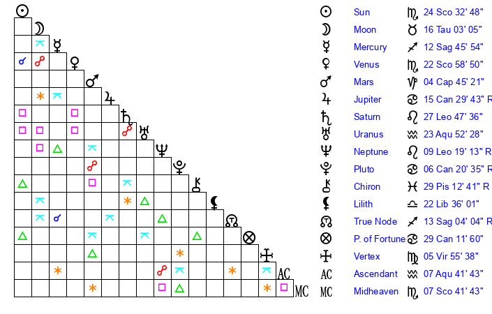 | Sun | 24 Scorpio 32 | 25 Scorpio 36 | 13 Pisces 4 |