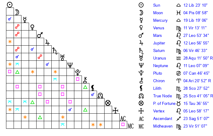 | Saturn | 7 Virgo 25 | 27 Pisces 13 | 11 Virgo 43 |