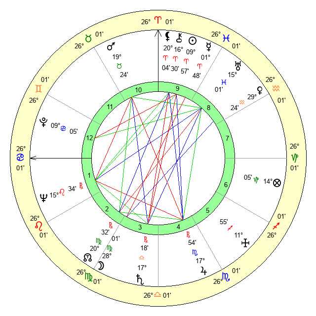 | Sun | 9 Aries 57 | 11 Aries 14 | 18 Cancer 21 |