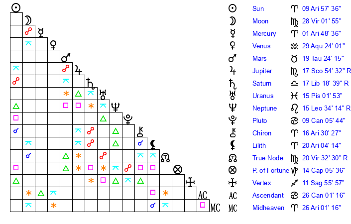 | Sun | 9 Aries 57 | 11 Aries 14 | 18 Cancer 21 |