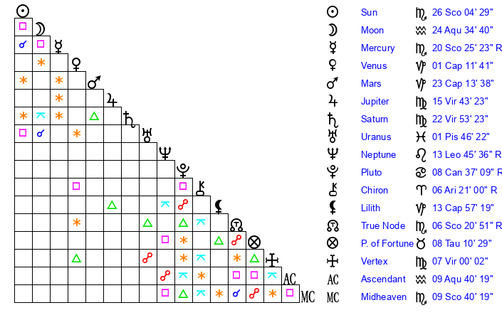| Sun | 26 Scorpio 4 | 26 Scorpio 36 | 12 Pisces 35 |