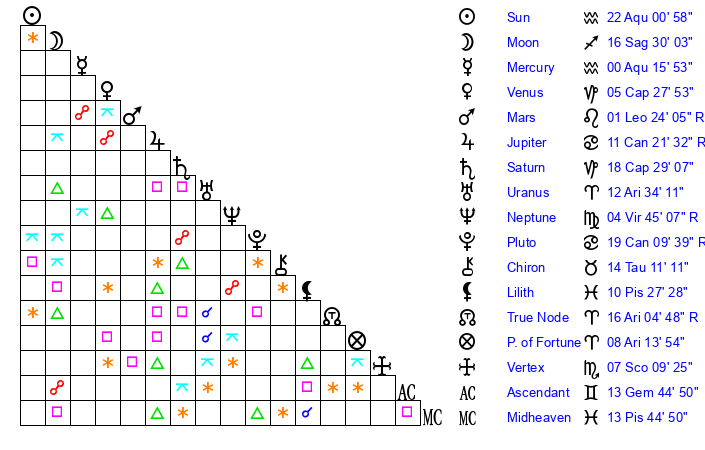 | Moon | 16 Sagittarius 27 | 12 Leo 54 | 14 Taurus 1 |