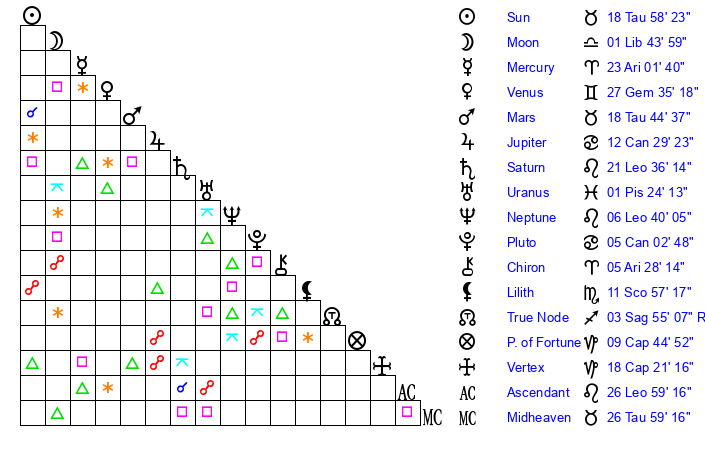 | Sun | 18 Taurus 58 | 20 Taurus 17 | 0 Virgo 27 |