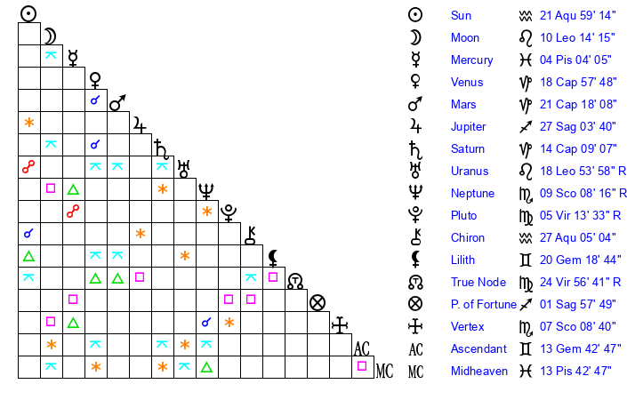 | Moon | 10 Leo 16 | 12 Leo 54 | 2 Capricorn 22 |