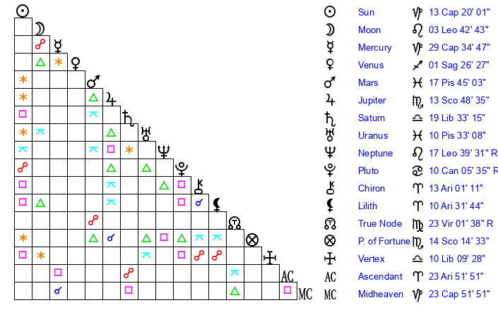 | Neptune | 17 Leo 38 | 29 Pisces 33 | 15 Leo 23 |
