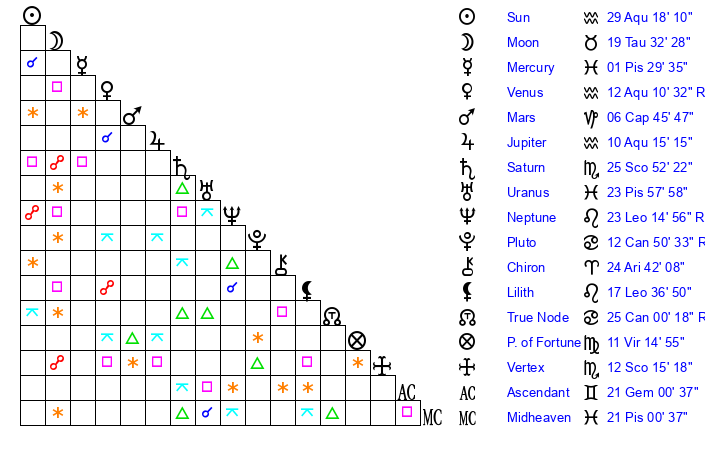 | Sun | 29 Aquarius 18 | 0 Pisces 17 | 6 Gemini 35 |