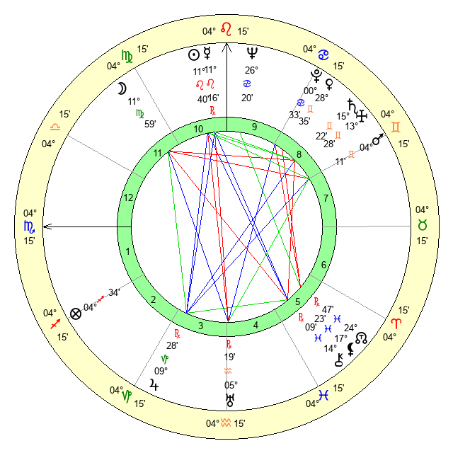 | Moon | 11 Virgo 54 | 17 Sagittarius 34 | 16 Libra 38 |