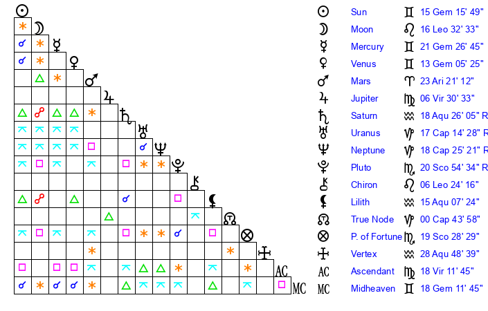 | Mercury | 21 Gemini 27 | 23 Gemini 15 | 12 Leo 39 |