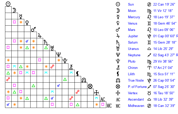 | Moon | 11 Virgo 17 | 9 Pisces 42 | 18 Leo 46 |
