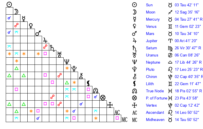 | Sun | 3 Taurus 42 | 4 Taurus 46 | 14 Cancer 45 |