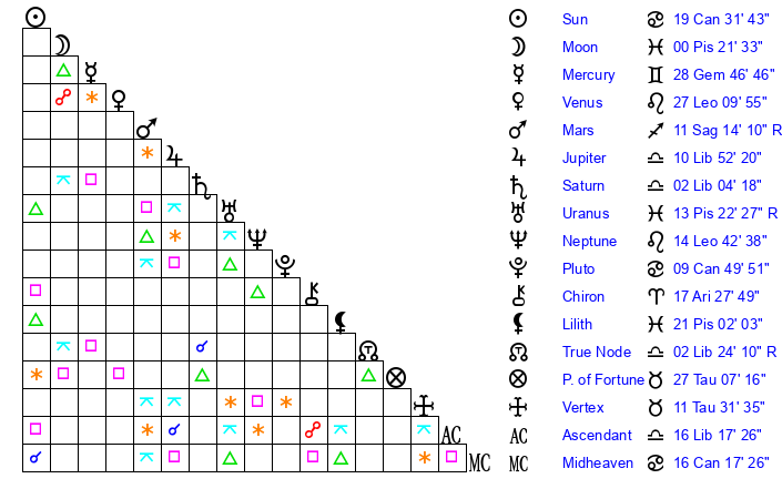 | Moon | 0 Pisces 20 | 12 Aquarius 59 | 12 Sagittarius 27 |