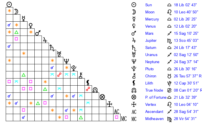 | Venus | 12 Libra 3 | 27 Virgo 18 | 5 Sagittarius 58 |