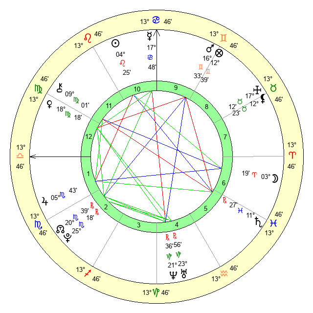 | Mercury | 17 Cancer 48 | 12 Leo 6 | 17 Virgo 42 |