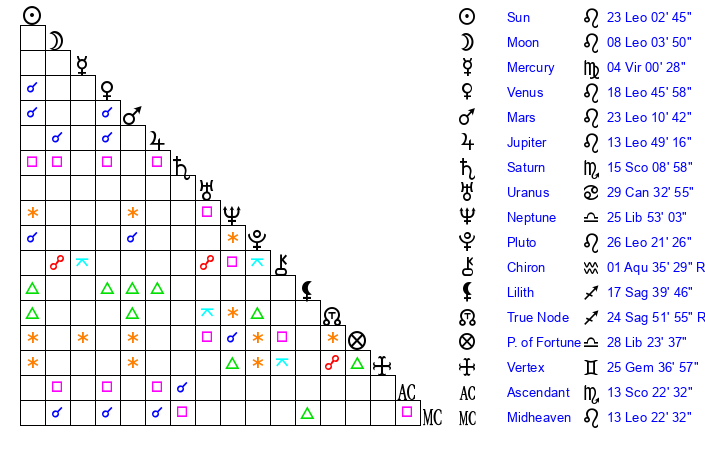| Moon | 8 Leo 1 | 0 Gemini 28 | 21 Aquarius 9 |