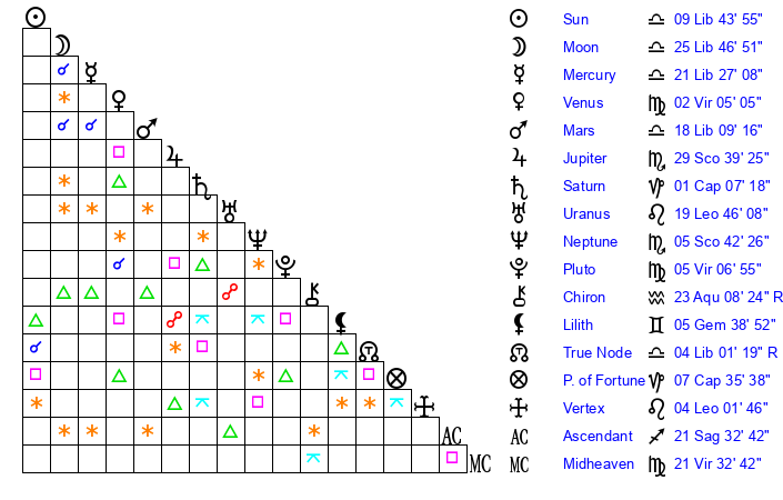 | Moon | 25 Libra 41 | 24 Aquarius 48 | 4 Aries 42 |