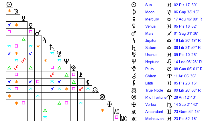 | Sun | 2 Pisces 18 | 3 Pisces 19 | 13 Gemini 16 |