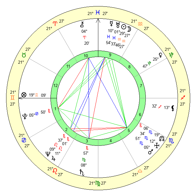 | Sun | 29 Aquarius 46 | 1 Pisces 18 | 12 Gemini 46 |