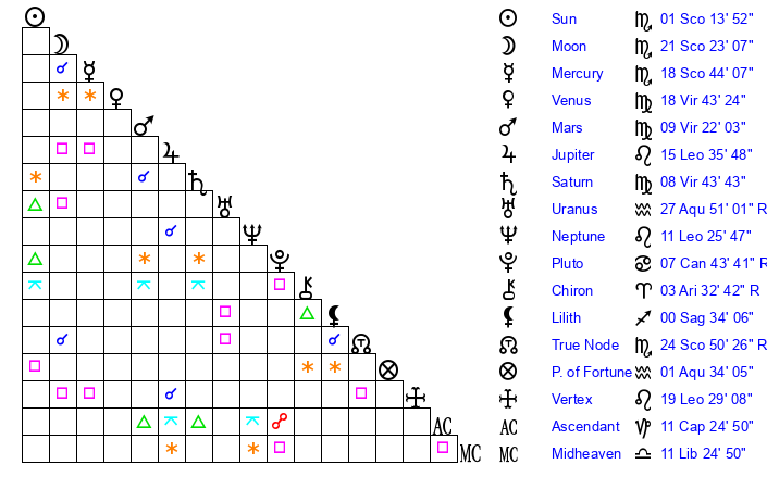 | Moon | 21 Scorpio 24 | 18 Sagittarius 11 | 13 Libra 15 |