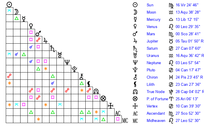| Sun | 16 Virgo 24 | 17 Virgo 1 | 5 Capricorn 23 |