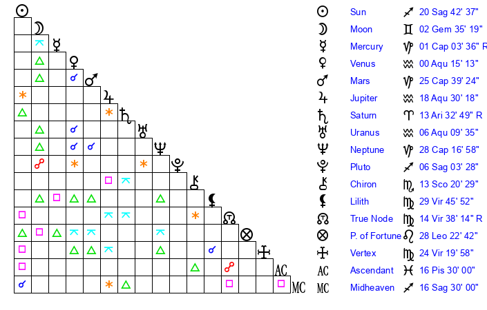 Pluto | 6 Sagittarius 3 | 0 Aquarius 30 | 7 Sagittarius 0 |