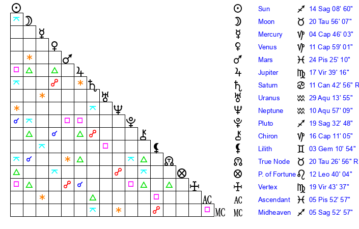 | Moon | 20 Taurus 56 | 20 Aquarius 27 | 3 Pisces 18 |