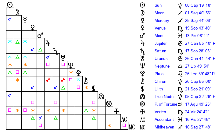 | Venus | 19 Scorpio 43 | 17 Aquarius 33 | 27 Capricorn 32 |